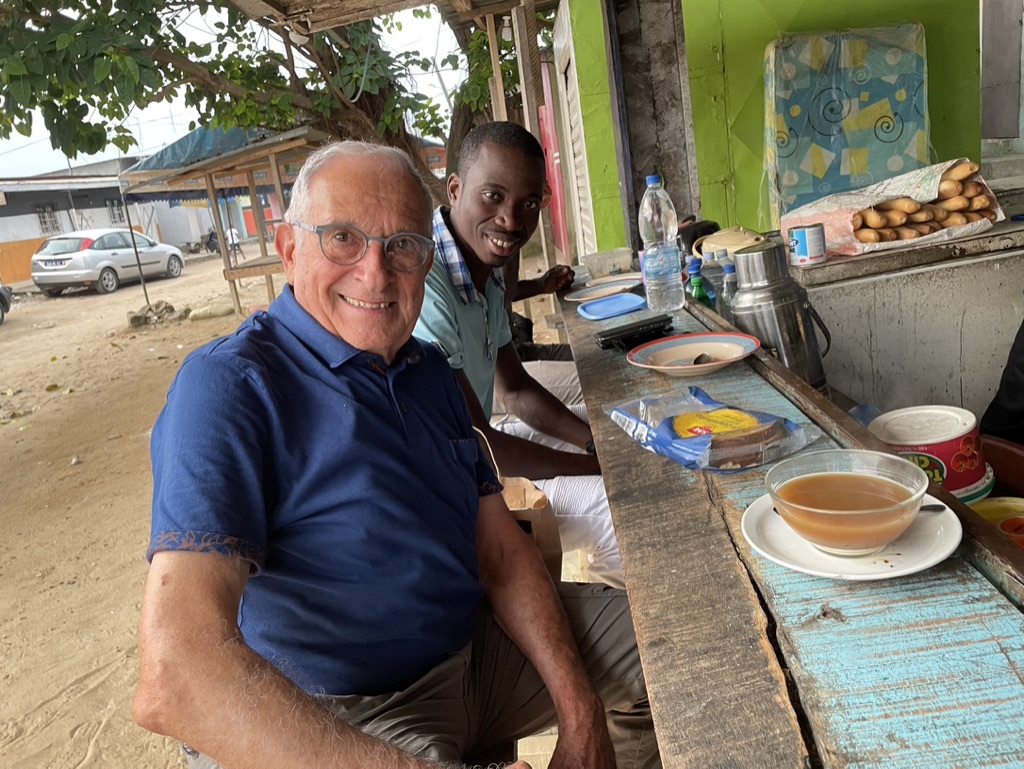 Kouamé parti depuis une semaine, vient me chercher ; nous voici attablés pour mon premier petit déjeuner en Côte d’Ivoire.